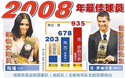 本报讯 北京时间1月13日,2008年度世界足球先生评选在瑞士苏黎世揭晓。此前已经获得了欧洲金球奖、欧足联年度最佳球员等重要奖项的葡萄牙球星克·罗纳尔多,力压阿根廷“金童”梅西和西班牙球星托雷斯等人,终于登上了世界足球先生的宝座,成为世界足坛名副其实的“先生专业户”。