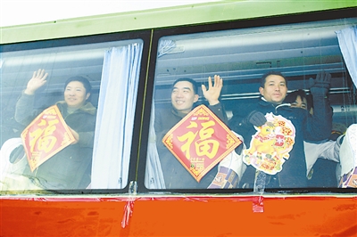 1月14日,在济南东部某建筑工地,山东交运集团济南市长途汽车东站的“农民工返乡直通车”载着回家过年的50多名贵州籍农民工启程。吕传泉 摄