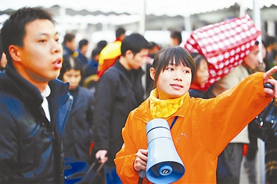 1月13日,志愿者陈雪凤(右)在为旅客导乘。春运开始以来,广州铁路职业技术学院的大学生志愿者们来到广州火车站参加志愿助春运行动,为旅客平安出行提供贴心周到的服务。新华社 卢汉欣 摄