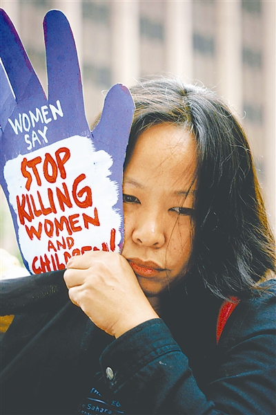 1月14日,一名菲律宾女子手持标语牌站在位于首都马尼拉的以色列大使馆外抗议以军在加沙的军事行动。标语牌上写着:停止杀害妇女和儿童。新华社发 路易斯·里瓦纳各 摄