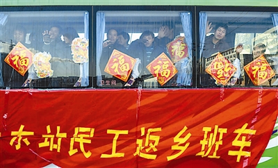 当日,山东交运集团开通的“农民工返乡直通车”来到济南一建筑工地,接送来自贵州安龙镇的50多名农民工兄弟返乡过年。在出发仪式上,工作人员为他们送上了对联、福字和热气腾腾的“春运饺子”。