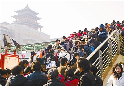 1月15日,在北京西客站外,旅客通过天桥进站。