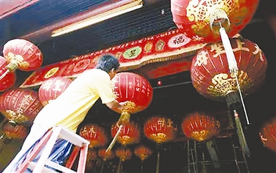 马来西亚是个多民族聚居的国家,其中华裔占总人口的25%左右。图为1月15日在中国牛年到来之际,在距首都吉隆坡东北500公里的瓜拉丁加奴,当地华裔正在庙门上挂灯笼,准备迎接春节。吉平 供图