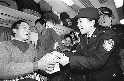 1月13日,在南京开往成都的列车上,铁路民警向四川灾区的农民工兄弟发放爱心糖果。 周振全 摄