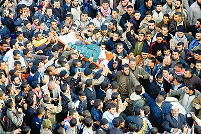 1月16日,巴勒斯坦伊斯兰抵抗运动(哈马斯)成员在加沙为该组织三号人物、“内政部长”赛义德·赛亚姆举行葬礼。赛亚姆于15日在以军空袭中丧生。新华社记者 纳赛尔 摄