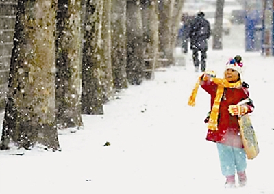 1月16日,韩国首都首尔下起了入冬以来最大的一场雪,一时间,整个城市银装素裹,一片洁白。图为一名儿童在被白雪覆盖的首尔街道上玩耍。阿健 供图