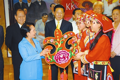 1月16日,菲律宾总统阿罗约(前左)在首都马尼拉的总统府马拉卡南宫接见中国四川地震灾区中学生代表团时接受羌族学生的礼物——带有“吉祥如意”四个字的红色羌绣吉祥包。阿罗约代表菲律宾政府和人民对100名学生的到来表示诚挚的欢迎。 新华社发 路易斯·里瓦纳各 摄