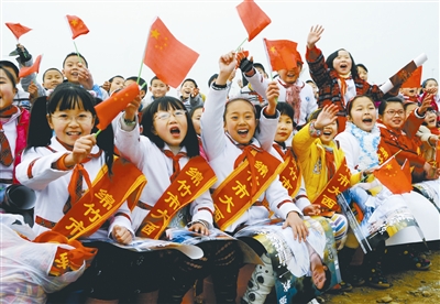 1月15日,地震灾区绵竹市的孩子们在观看中国文联“送欢乐,下基层”演出。