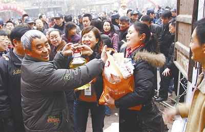 1月18日,负责开发的重庆旺德实业公司在新春到来之际,在重庆市北碚区进行开发商慰问拆迁户活动。北碚区朝阳街道文星湾片区351户拆迁户收到了粮油等年货。 秦廷富 摄