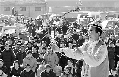 1月18日,一名演员正在集市上为村民表演舞蹈。当日,是农历“小年”,宁夏银川市永宁县望洪镇组织各部门下乡入户,进行文化、卫生、科技、法律“四下乡”活动,为村民们送知识、送祝福。明成 摄