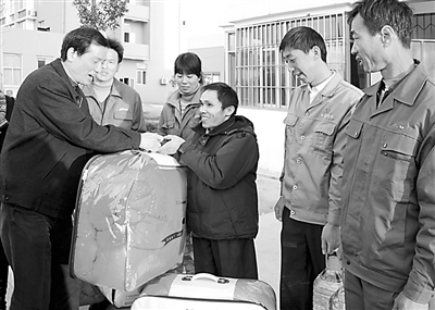 1月15日,福建省三明市总工会在三明高新技术开发区金沙园举办农民工专场慰问晚会,为农民工送食用油、被褥等生活必需品,送科技、健康等书籍,同时送上精彩的文艺节目。图为三明市总工会常务副主席吴建增(左)为农民工送上慰问品。