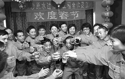 1月20日,上海隧道股份青草沙原水过江管工地的200余名农民工欢聚一堂,共庆新春佳节。这些农民工为了尽早开通隧道,让上海市民喝上优质饮用水,放弃了春节回家团圆的机会,继续奋战在掘进施工第一线。 新华社记者 任珑 摄