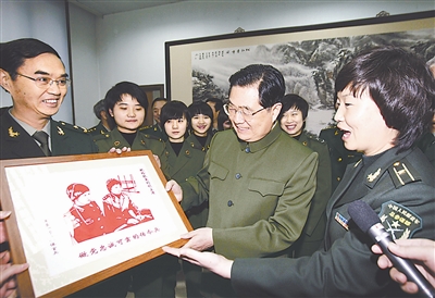 接着,胡锦涛参观了话务训练教室,与正在训练的话务女兵进行了亲切交谈,询问了她们的工作、生活等情况。胡锦涛勉励年轻的话务女兵,要刻苦学习,掌握技能,当好党的“传令兵”。