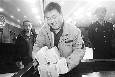北京海淀法院加大执行力度,于1月20日将追回的拖欠工资款向被欠薪农民工发放,总额计100余万元。其中,最大的一笔单款执行额超过60万元。图为农民工代表前来领取欠款时露出舒心的笑容。王俭 摄