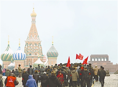 1月21日,在俄罗斯首都莫斯科,数百名俄共党员及普通民众排队向红场边的列宁墓(右后)献花圈。当日,数百名俄共党员及普通民众举行活动,纪念列宁逝世85周年。1921年1月21日,无产阶级革命的伟大导师列宁在莫斯科附近的哥尔克村逝世,享年54岁。新华社记者 沈伯韩 摄