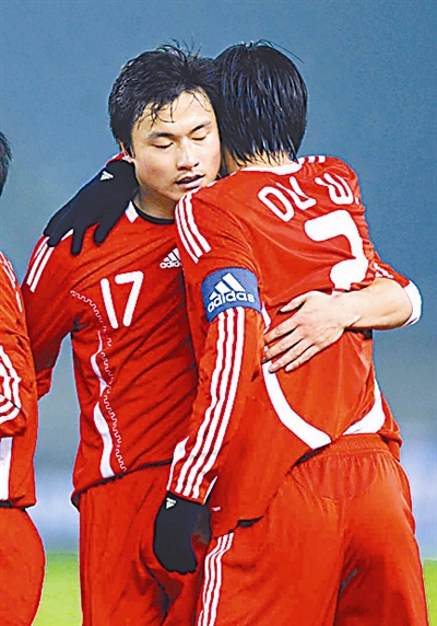 1月21日,队长杜威向申花队的队友郜林祝贺。而今年的中超,郜林有可能被申花卖掉。当日,在杭州举行的亚洲杯预选赛小组赛中,中国队主场以6比1战胜越南队,郜林独进三球。 新华社记者 徐昱 摄