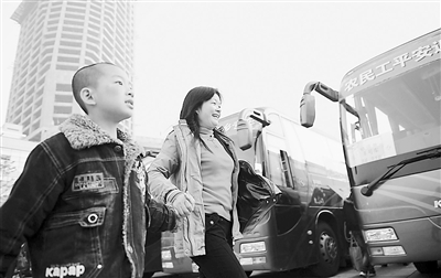 1月21日上午,农民工牵着孩子提着行李开心地上车。当日,在厦门市工人文化宫广场前,11辆大巴车满载近500名来厦务工人员,从厦门开往福建龙岩、长汀、上杭、连城和永定等地,免费运送他们返乡过年。张向阳 摄
