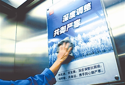 海南海口市,一家企业的电梯里张贴着鼓励员工同心抵抗金融风暴给企业带来危机困境的宣传画。童国强 摄
