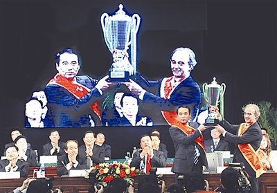 北京国安俱乐部的“绿色狂飙”赛车队参加了2008年首届“世界超级联盟方程式汽车大赛”,勇夺总冠军。图为国安俱乐部总经理李小明(左)代表车队领取总冠军奖杯。 本报记者 许之丰 摄