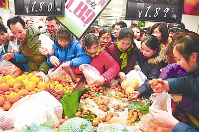 1月23日,市民在超市选购水果。 春节临近,北京怀柔区年货市场红火,市民纷纷走进超市选购年货,一派红红火火过大年的景象。新华社发(卜向东 摄)