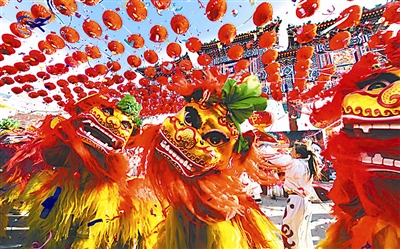1月25日上午,第二十四届北京地坛春节文化庙会在欢乐的气氛中拉开牛年春节的序曲。图为欢腾的“金狮”舞出洋洋喜气。