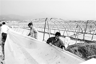 2月2日,江西省吉水县乌江镇农民袁小华聘请的瓜农抢抓晴好天气搭大棚。袁小华是外出务工后回乡创业的,他和别人合伙在吉水县文峰镇炉下村和当地农民签订土地流转合同,租赁土地500亩,利用自己的特长,带领当地群众种植四季西瓜。