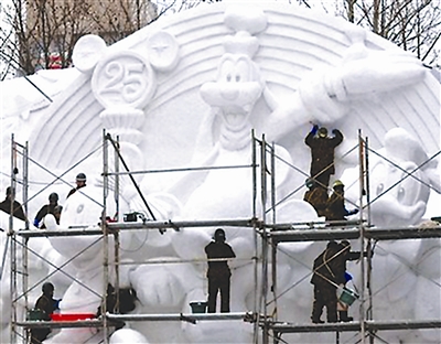第六十届著名的日本“札幌冰雪节”将于2月5日拉开帷幕。由于全球金融危机,今年的“札幌冰雪节”吸引人数大幅下降,观光客只有去年的70%。图为2月2日,日本自卫队员在巨大的迪斯尼卡通雪雕前做开幕前的收尾工作。阿健 供图