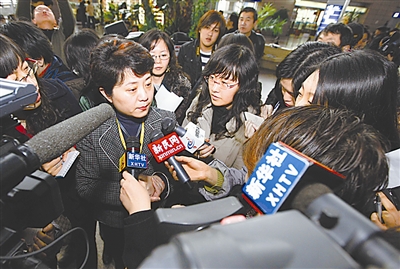 2月3日,随行的上海旅游局的工作人员正在浦东机场接受记者采访。