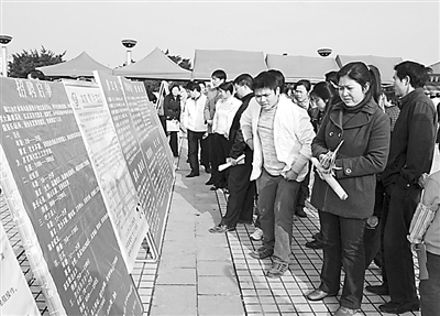 2月1日,江西省南康市2009年春季就业和再就业招聘大会上,几名青年正在索寻就业信息。据悉,招聘会吸引5万余人参加,其中大部分是春节前返乡的农民工,人数之多为历届招聘会之最。此次招聘会共有260家用人单位提供15000个就业岗位。据统计,当天求职登记的约9600人,现场录用约4500人。许朝阳 摄