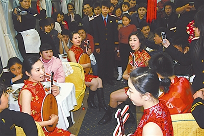 1月25日,K185次列车春晚。女列车员穿上旗袍,表演《北京前门情思大碗茶》。本报通讯员 殷庆 摄