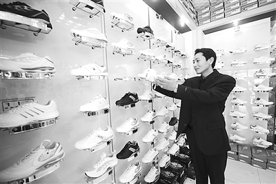 2月4日,返乡农民工罗玉东在鞋店内做营业前的准备。重庆市永川区大安镇农民工罗玉东在广东、福建等地打工17年,2008年9月因受金融危机影响返回家乡永川。他和亲友在政府有关部门的帮助下,在重庆、安徽、湖北等地办起了多家鞋业零售连锁店,并计划年内在重庆地区扩大经营范围。
