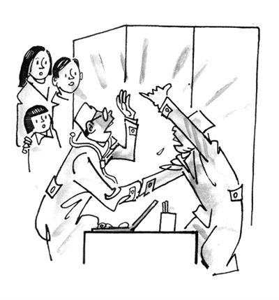 据《济南时报》报道,济南某医院某诊室近日发生一起怪事:两位坐诊医生不顾患者的等候,竟然为了药品回扣分配不均之事,在诊室争吵不休。