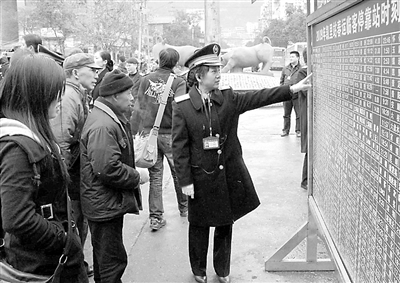 2月2日,成都铁路局凯里车务段“老弱病残服务队”正在为一位农民工讲解返程列车时刻表。随着贵州节后返程农民工流高峰的到来,为确保每一位返程农民工不上错车,凯里车务段“老弱病残服务队”24小时轮流为农民工提供服务。 姜泽鹏 摄