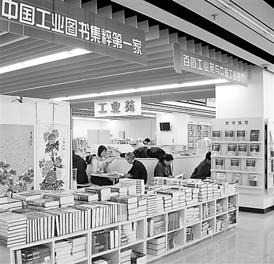 来到工业苑,笔者看到,在近1000平方米的营业厅内,汇集了包括机械、汽车、电工电子、仪器仪表、建筑、化工、冶金、石油、矿业、煤炭、信息、交通、环保、轻工等在内的各行业工具书、标准、学术著作、实用图书及工人读物。据企划部经理杨振介绍,这些工业图书共有4万种,书店按照专业分门别类摆放。在这里,笔者还看到一个工人培训专架。杨振说,这是为了方便参加各种工业技能考试的读者而特别设立的,主要销售各种技能类培训教材、职业资格考试用书及工具书。在书架旁的过道处,很多读者坐在书桌旁抱着厚厚的工业书“奋笔疾书”。对于这种现象,杨振也表示理解:“有些读者可能只需要一本书里一、两页的资料。买回去不划算,就在这抄起来。只要不损坏图书,我们也是欢迎的。”为了方便读者阅读,这里还特别设立了书桌和凳子。