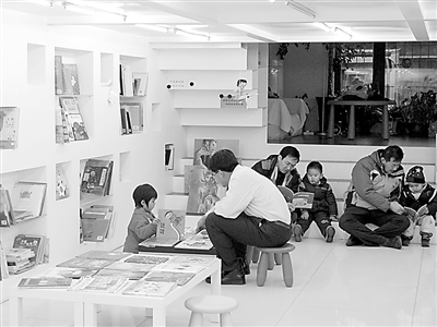 白色的小书桌,彩色的小板凳。三位年轻的爸爸各自捧着图画书,津津有味地和他们的孩子分享着童话故事……如果不是去过墨盒子绘本书馆,很难相信这样温馨的画面是出自一家小书店。