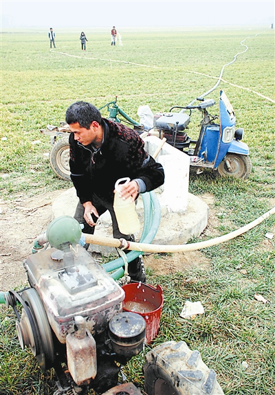 2月6日上午,安徽省界首市舒庄镇赵小庙村农民正在利用机械从田头机井取水灌溉受旱的麦田。界首市自去年10月以来,境内基本没有降雨过程,受旱小麦面积40多万亩。面对严重旱情,该市采取城乡联动,加大人员、物资的调配和投入,认真向受灾农户兑现抗旱补贴,全力以赴打好抗旱保苗攻坚战。 戴民 摄