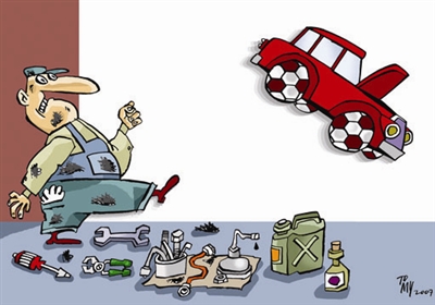 球迷本色啊!修理汽车也给人家装上足球当轮子!
