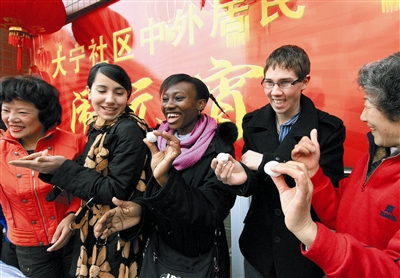 2月7日,来自美国的杰克孙(右二)和雅娜(右三)在居民小区学习包元宵。