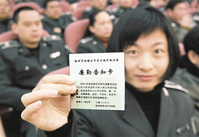 2007年3月9日,江苏省徐州市鼓楼区市容与城市管理执法局在全市系统单位,首推“廉勤告知卡”制度,塑造全新的市容和城管执法队伍和谐形象。据了解,新实施的“廉勤告知卡”旨在加强服务意识,让机关工作人员在行政执法或提供服务的过程中,首先要向工作对象说明自己的身份、姓名、工号、告知工作对象,如发现本人有吃、拿、卡、要等办事推诿、扯皮、不作为、乱作为或其它行为,可向“廉勤告知卡”发放单位投诉,还可以向上级单位和纪检监察部门举报。 雍君 摄