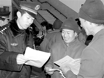为了让旅客温暖出行、平安回家,春运期间,太原铁路警方把拉近与旅客间的距离,不断提高服务旅客的工作水平当作工作重点。图为民警向旅客宣传铁路安全常识。 何广宏 摄