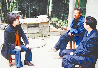 2006年10月,王瑛(左)在南江县杨坝镇尖山村与群众座谈,商讨致富之策。新华社发