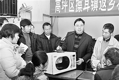 2月7日上午,四川南充市高坪区总工会在擦耳镇组织的第一批返乡农民工培训,家电高级工程师正在给即将在当地从事家政服务的100多名农民工传授微波炉、电冰箱、吸尘器、空调、豆浆机等家用电器的使用知识。日前,四川南充市高坪区工会、劳动就业、农业等部门相互配合,决定对3.5万返乡农民工免费进行职业技能应急培训。邱海鹰 唐军 摄