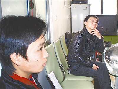 杨正拾(左)应聘,跟老板(右)谈判。杨正强在一边帮腔,老板没占多少上风。本报记者 龙巨澜 摄