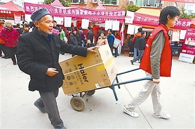 重庆市江北区鱼嘴镇杭正明老大爷近日将新买的家电运回家中,他成为江北区“家电下乡”活动受惠第一人。