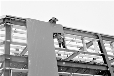 风雪天气耽误了中山站“十五”能力建设项目的工期,承担建设任务的中铁建工集团施工人员利用天气相对较好的时间窗口,抓紧施工。图为队员正在雪中进行彩钢板安装作业(2009年2月9日摄)。 新华社记者 刘奕湛 摄