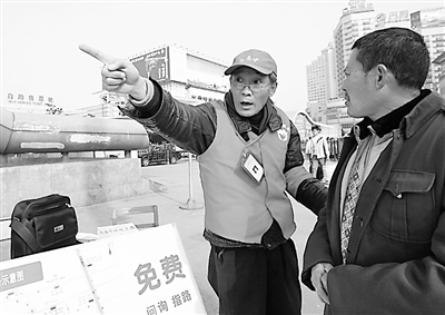 2月10日,56岁的志愿者张卫国在上海火车站南广场为旅客免费指路。像他这样身穿统一制服、服务规范的志愿者在上海站地区有30余名。这批志愿者自2007年8月上岗以来,为过往旅客问询指路提供方便,使他们避免误乘和受骗上当。
