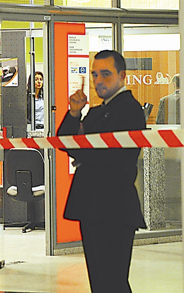12日,在比利时首都布鲁塞尔的欧洲议会办公楼内,保安人员在遭持枪抢劫的ING银行办公网点外值守。当天,该网点遭不明身份者持枪抢劫。抢劫者拿到钱后立即逃走,没有造成人员伤亡。目前银行损失数额尚不清楚。新华社发