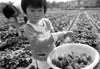 2月14日,一个小姑娘在南宁市郊体验采摘草莓。目前广西的早春草莓已经成熟,一些南宁市民利用周末到郊外农家的田地里体验采摘草莓的乐趣。 新华社记者 张周来 摄