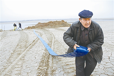2月15日,汤阴县韩庄乡庞洼村的干部群众从2.5公里以外的汤河水库底部提灌水源,浇灌岗坡麦田。从2008年11月中旬以来,河南省汤阴县降水较常年同期平均值减少九成多,全县最大的汤河水库和部分机井干涸。针对当前农作物严重干旱的情况,汤阴县组织干部群众开展抗旱保苗工作。新华社发 张志勇 摄