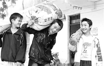 2月14日,广西昭平镇中学初一学生刘坚(中)、梁志杰(右一)、冯尚贵(左一)被免除住宿费后,高兴不已。当日是广西昭平县中小学校开学注册的第一天,该县194所农村义务教育公办学校的一万多名寄宿生全部被免除住宿费。从今年春季学期开始,广西将停止收取农村义务教育公办学校寄宿生住宿费。此前,广西全面实现农村免费义务教育。